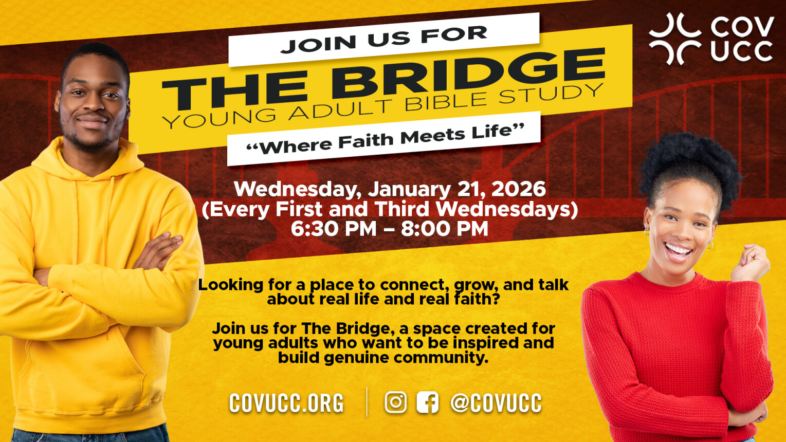 THE BRIDGE YOUNG ADULT BIBLE STUDY JAN 21January 21, 2026 6:30pmAddress: Barbara W. Smith Family Life Center, South Holland, IL US 60473Add to Calendar
