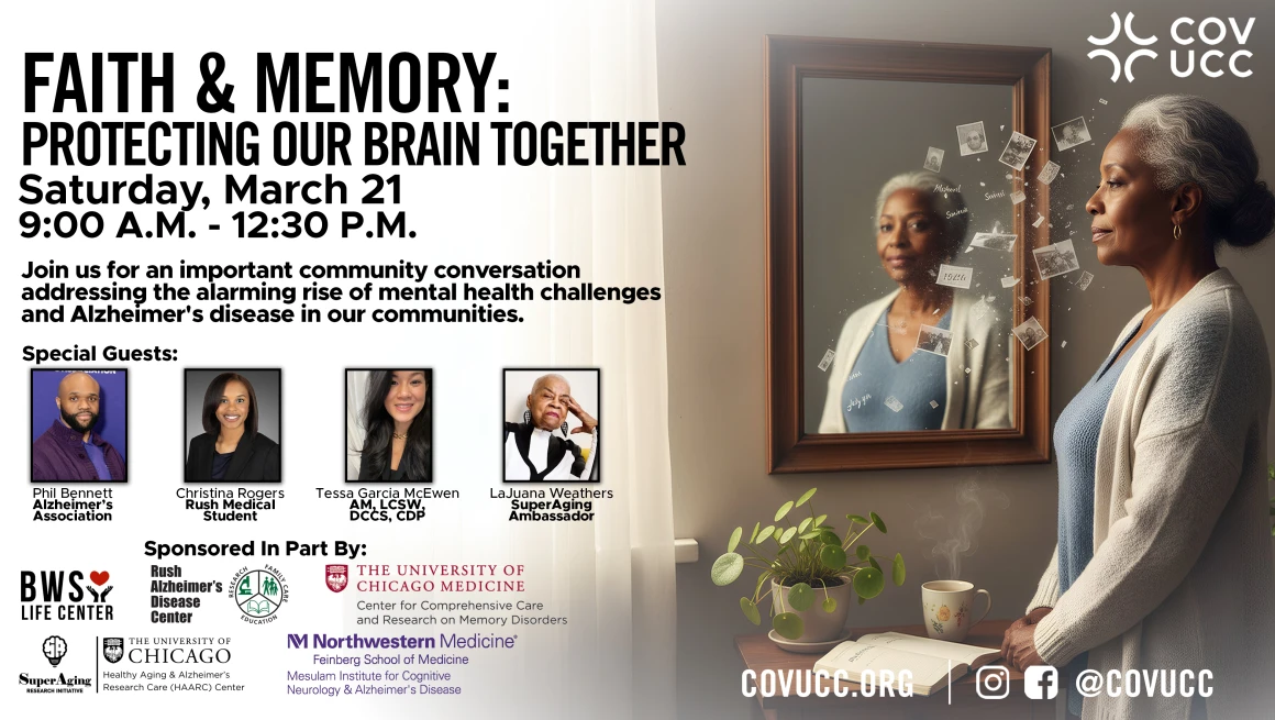 Join us for an important conversation addressing the alarming rise of mental health challenges and Alzheimer's disease in our communities. Our special guests are Phil Bennett, Alzheimer's Association, Christina Rogers, Rush Medical Student, Tessa Garcia McEwen, AM, LCSW, DCCS, CDP, and LaJuana Weathers, SuperAging Ambassador.